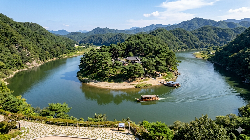 이곳은 삼면이 강으로 둘러싸이고 뒤쪽은 험준한 절벽이라 배가 없으면 나갈 수 없는 육지 속의 섬 같은 곳이죠. 실제로 단종이 이곳에서 머물며 한양에 두고 온 정순왕후를 그리워하며 쌓았다는 망향탑이나, 자신의 비참한 처지를 하소연했다는 천연기념물 관음송이 지금도 그 자리를 지키고 있어요.